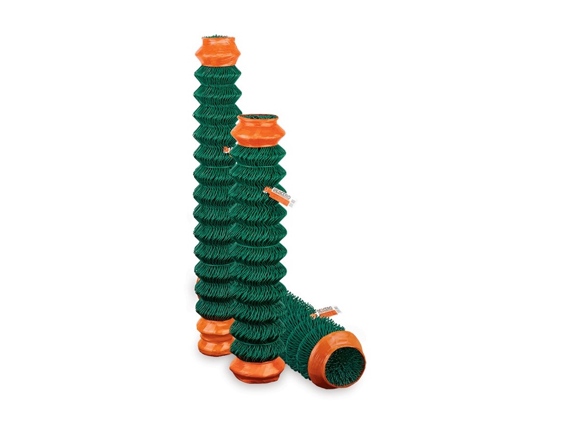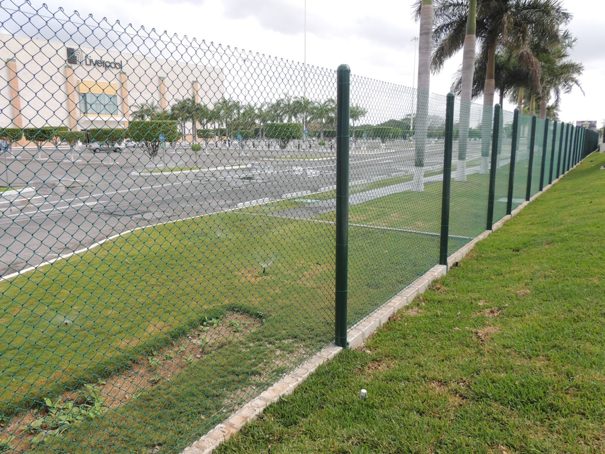 Malla fabricada con alambre de acero galvanizado y forrado de PVC, entretejido helicidalmente formando una estructura con formas de rombos. Disponible en varios calibres (grosor de alambre), aberturas (distancia entre alambre y alambre que conforman el rombo), y alturas.